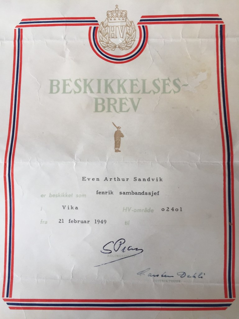 «Even Artur Sandvik, født den 15/9-1915 har tjenestegjort som reservekonstabel hos oss fra 19/6-1940 til 7/9-1941, da han sluttet etter eget ønske.