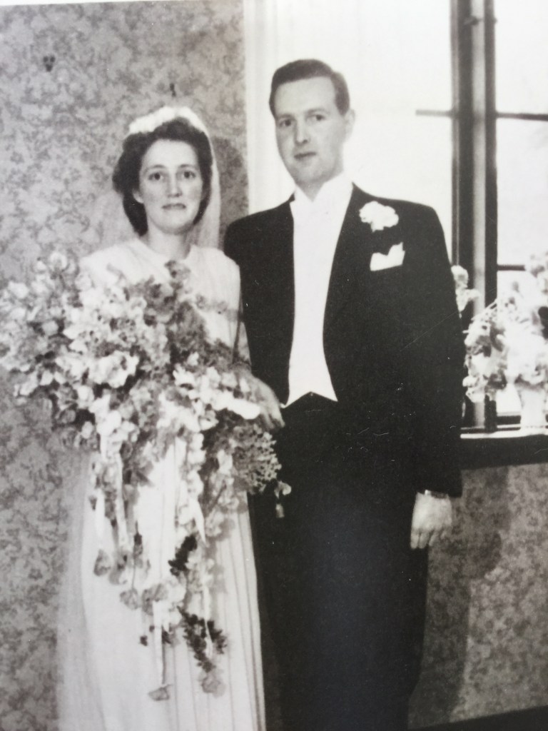 Vi giftet oss 19.juni 1943. Bryllupet ble holdt hjemme hos mor og far. To netter før den store dagen kom Hans Christian kjørende med maten vi skulle bruke. Kjøtt, fløte, egg osv.